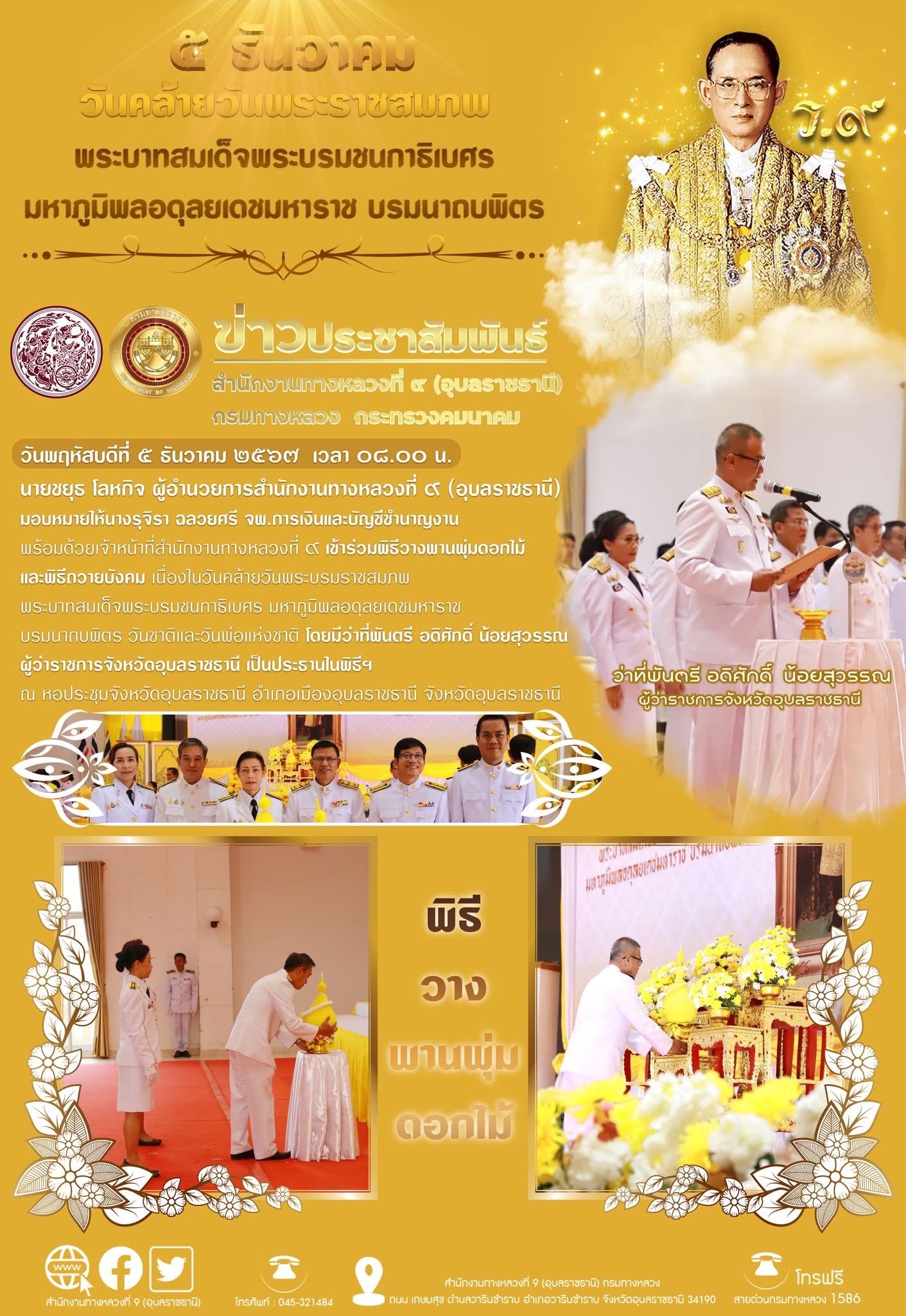พิธีวางพานพุ่มดอกไม้และพิธีถวายบังคม วันคล้ายวันพระบรมราชสมภพรัชกาลที่ 9 วันชาติและวันพ่อแห่งชาติ