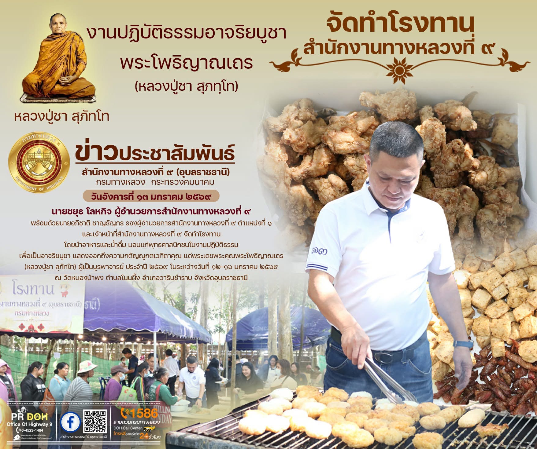 วันอังคารที่ ๑๓ มกราคม ๒๕๖๙ นายชยุธ โลหกิจ ผู้อำนวยการสำนักงานทางหลวงที่ ๙ พร้อมด้วยนายอภิชาติ ชาญธัญกร รองผู้อำนวยการสำนักงานทางหลวงที่ ๙ ตำแหน่งที่ ๑ และเจ้าหน้าที่สำนักงานทางหลวงที่ ๙ จัดทำโรงทานโดยนำอาหารและน้ำดื่ม มอบแก่พุทธศาสนิกชนในงานปฏิบัติธรรม เพื่อเป็นอาจริยบูชา แสดงออกถึงความกตัญญูกตเวทิตาคุณ แด่พระเดชพระคุณพระโพธิญาณเถร (หลวงปู่ชา สุภัทโท) ผู้เป็นบูรพาจารย์ ประจำปี ๒๕๖๙ ในระหว่างวันที่ ๑๒-๑๖ มกราคม ๒๕๖๙ ณ วัดหนองป่าพง ตำบลโนนผึ้ง อำเภอวารินชำราบ จังหวัดอุบลราชธานี
