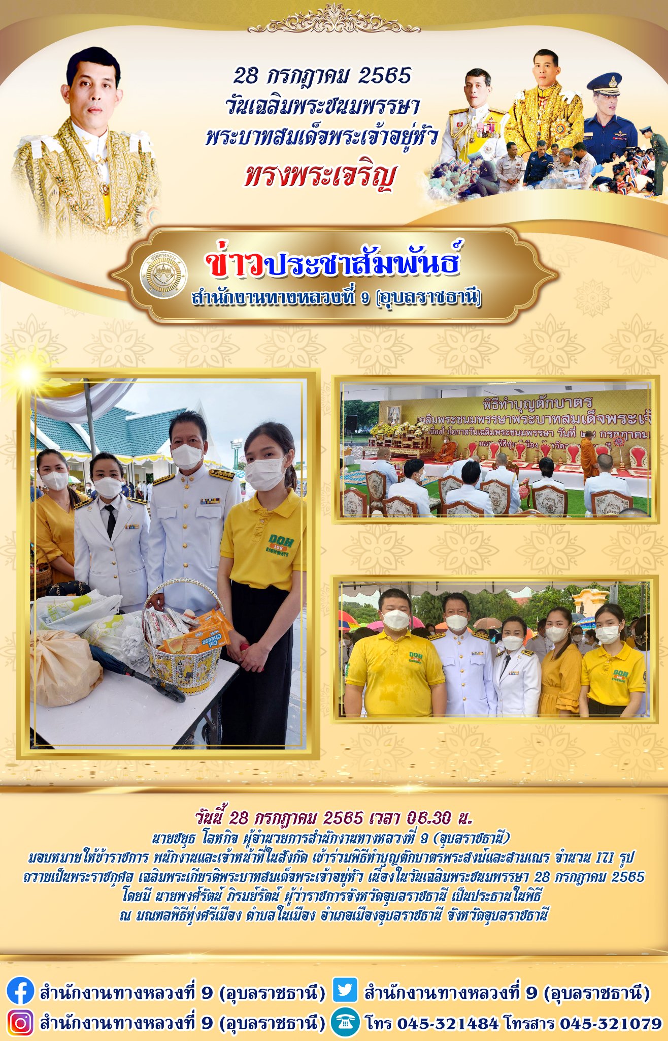 วันนี้ 28 กรกฏาคม 2565 เวลา 06.30 น. นายชยุธ โลหกิจ ผู้อำนวยการสำนักงานทางหลวงที่ 9 (อุบลราชธานี) มอบหมายให้ข้าราชการ พนักงานและเจ้าหน้าที่ในสังกัด เข้าร่วมพิธีทำบุญตักบาตรพระสงฆ์และสามเณร จำนวน 171 รูป ถวายเป็นพระราชกุศล เฉลิมพระเกียรติพระบาทสมเด็จพระเจ้าอยู่หัว เนื่องในวันเฉลิมพระชนมพรรษา 28 กรกฏาคม 2565 โดยมี นายพงศ์รัตน์ ภิรมย์รัตน์ ผู้ว่าราชการจังหวัดอุบลราชธานี เป็นประธานในพิธี ณ มณฑลพิธีทุ่งศรีเมือง ตำบลในเมือง อำเภอเมืองอุบลราชธานี จังหวัดอุบลราชธานี