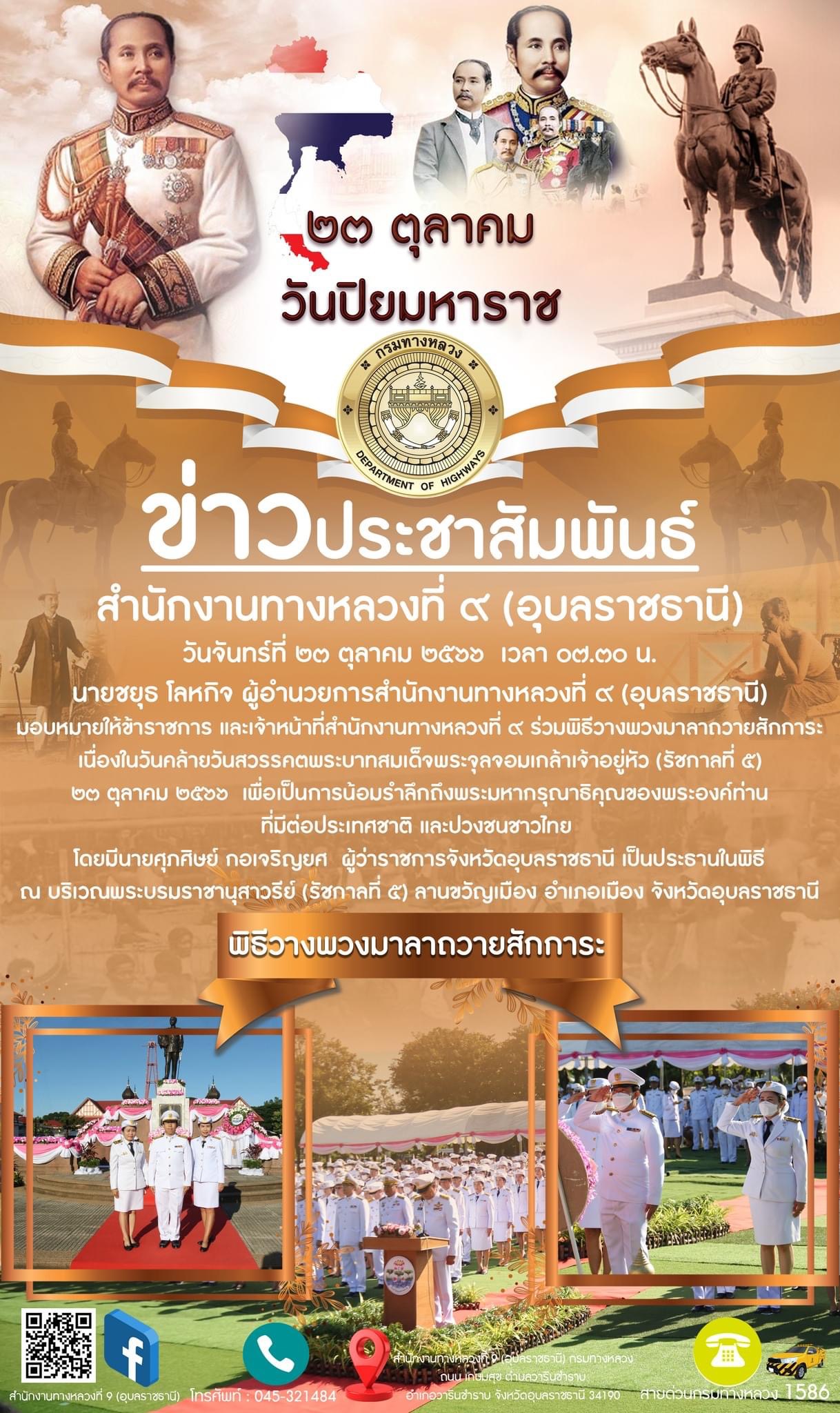 วันจันทร์ที่ ๒๓ ตุลาคม ๒๕๖๖ เวลา ๐๗.๓๐ น. นายชยุธ โลหกิจ ผู้อำนวยการสำนักงานทางหลวงที่ ๙ (อุบลราชธานี) มอบหมายให้ข้าราชการ และเจ้าหน้าที่สำนักงานทางหลวงที่ ๙ ร่วมพิธีวางพวงมาลาถวายสักการะ เนื่องในวันคล้ายวันสวรรคตพระบาทสมเด็จพระจุลจอมเกล้าเจ้าอยู่หัว (รัชกาลที่ ๕) ๒๓ ตุลาคม ๒๕๖๖ เพื่อเป็นการน้อมรำลึกถึงพระมหากรุณาธิคุณของพระองค์ท่านที่มีต่อประเทศชาติ และปวงชนชาวไทย โดยมีนายศุภศิษย์ กอเจริญยศ ผู้ว่าราชการจังหวัดอุบลราชธานี เป็นประธานในพิธี ณ บริเวณพระบรมราชานุสาวรีย์ (รัชกาลที่ ๕) ลานขวัญเมือง อำเภอเมือง จังหวัดอุบลราชธานี