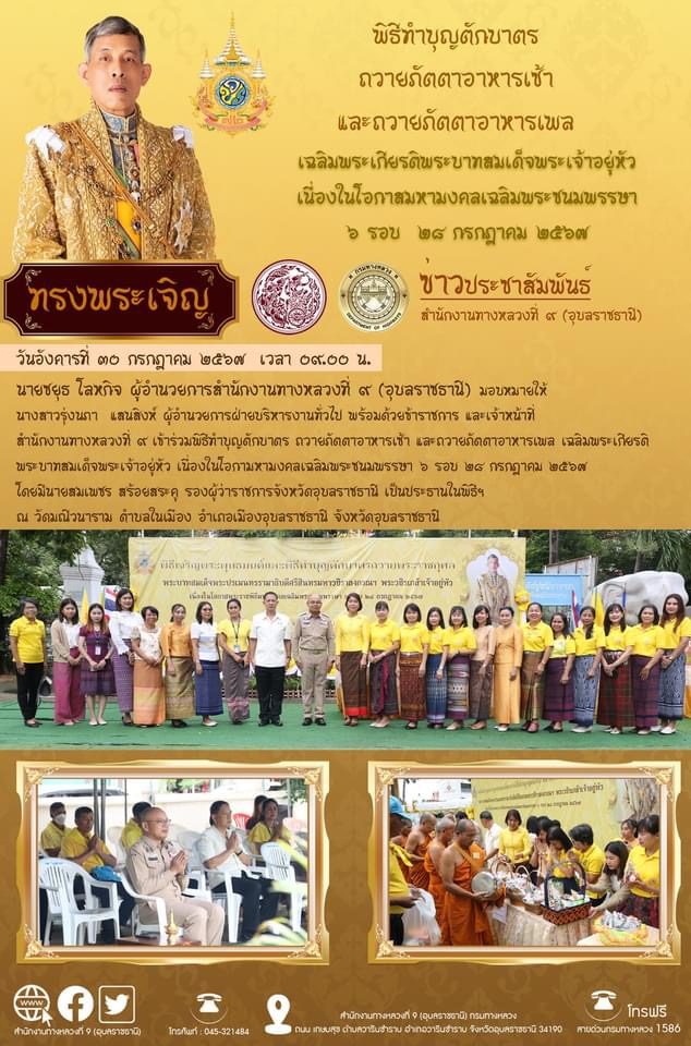 วันอังคารที่ ๓๐ กรกฎาคม ๒๕๖๗ เวลา ๐๙.๐๐ น. นายชยุธ โลหกิจ ผู้อำนวยการสำนักงานทางหลวงที่ ๙ (อุบลราชธานี) มอบหมายให้นางสาวรุ่งนภา แสนสิงห์ ผู้อำนวยการฝ่ายบริหารงานทั่วไป พร้อมด้วยข้าราชการ และเจ้าหน้าที่สำนักงานทางหลวงที่ ๙ เข้าร่วมพิธีทำบุญตักบาตร ถวายภัตตาอาหารเช้า และถวายภัตตาอาหารเพล เฉลิมพระเกียรติพระบาทสมเด็จพระเจ้าอยู่หัว เนื่องในโอกามหามงคลเฉลิมพระชนมพรรษา ๖ รอบ ๒๘ กรกฎาคม ๒๕๖๗ โดยมีนายสมเพชร สร้อยสระคู รองผู้ว่าราชการจังหวัดอุบลราชธานี เป็นประธานในพิธีฯ ณ วัดมณีวนาราม ตำบลในเมือง อำเภอเมืองอุบลราชธานี จังหวัดอุบลราชธานี